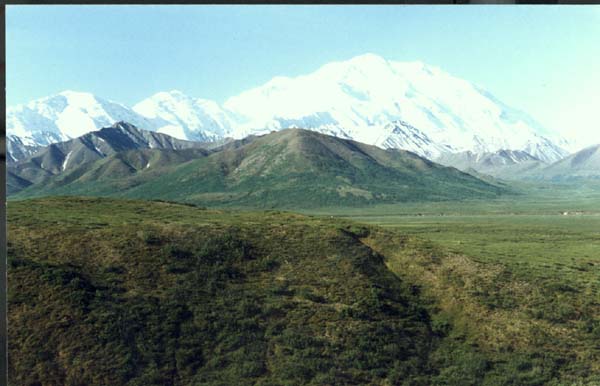 Денали возвышается над тундрой и в ясную погоду видна за сотни