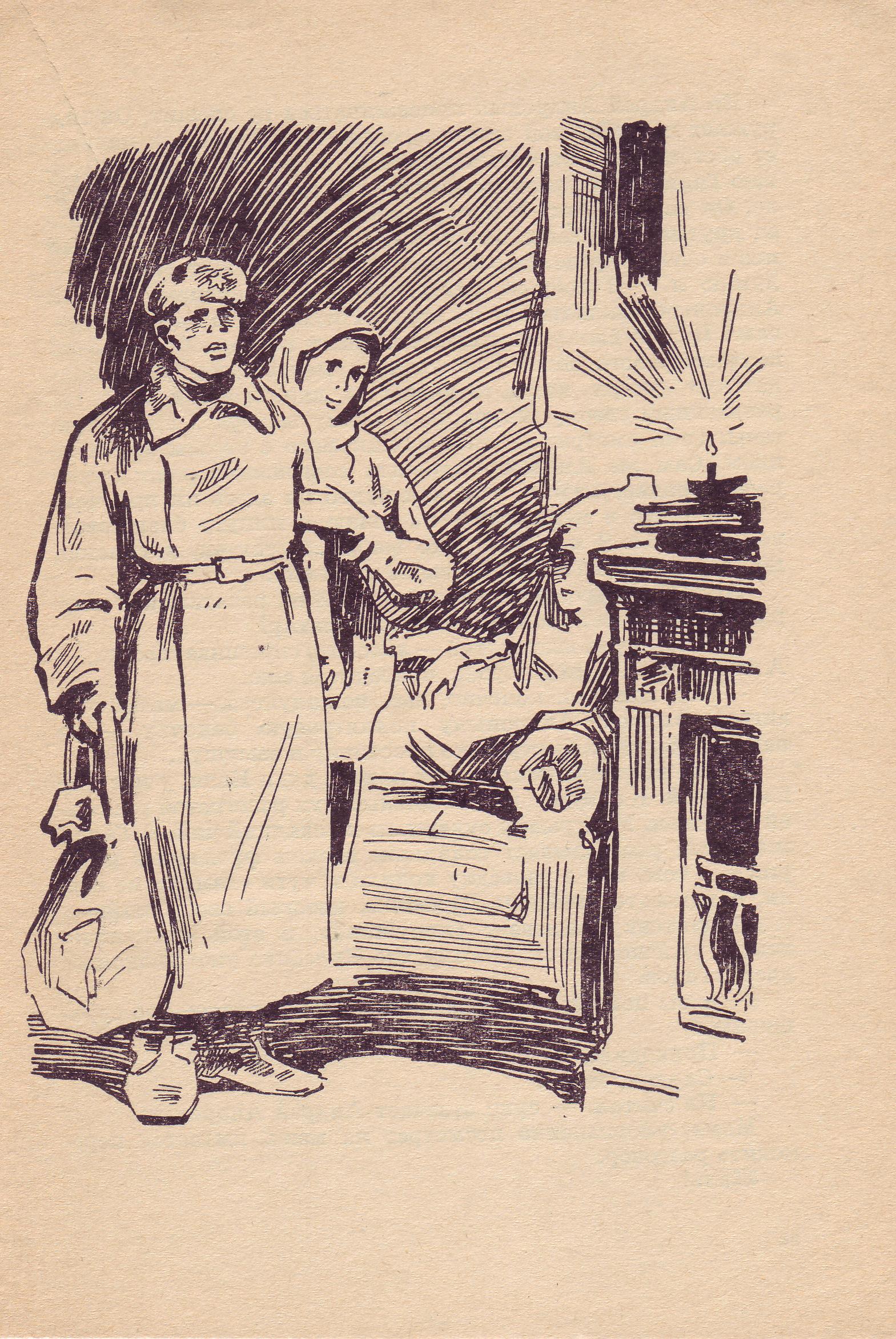 Мы садимся поближе к коптилке. Обняв меня за плечи одной рукой, легкой