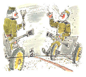 Генерал. Смирно! Разговоры с неприятелем прекратить! Итак, начинаем по сигналу... (Ходит по позиции.) Что я вижу? У неприятеля наши секретные снаряды? Измена, понятно. Придется доложить. (Превращается в Премьера.)