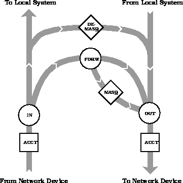 Masquerading takes place after passing the forward firewall filter. Demasquerading is done after receiving a packet and demasqueraded packets bypass the forwarding filter. Figure 2 shows the kernel flow diagram including (de)masquerading.