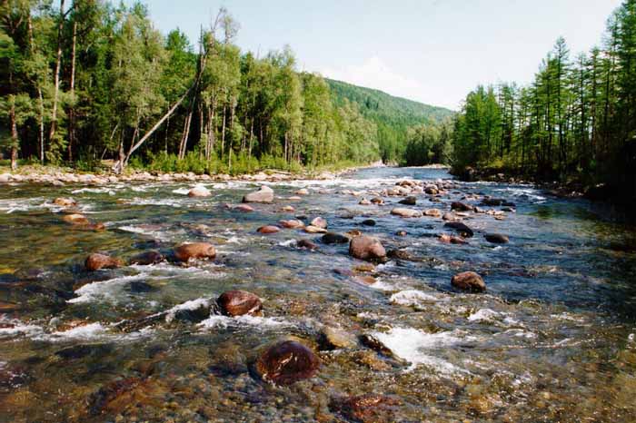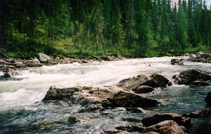 приобретает бурный характер, пороги и шиверы перемежаются плесами, иногда