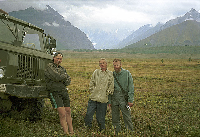 На плато перед пер. Орой. Справа налево: В.Юрин, И.Валяева, К. Наумов и его вездеходный экипаж.