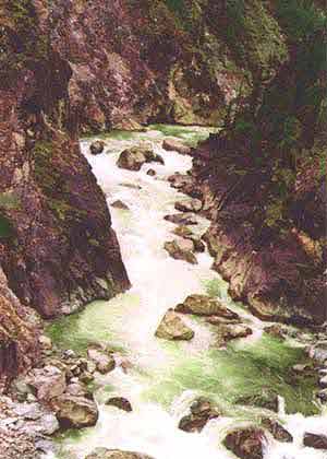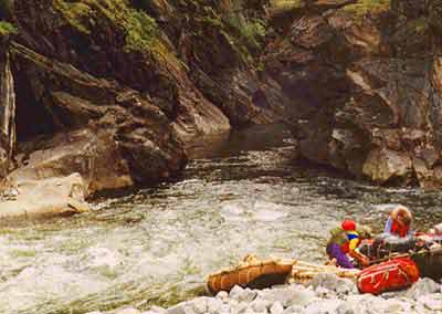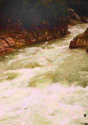 Дальнейшие препятствия - это большие подводные и надводные камни, бочки, стоячие валы, узости и прижимы. Для того чтоб проходить ущелье, необходимо иметь нормальную группу с хорошей организацией страховки, и воду ниже среднего. Порог - водопад обносится по правому берегу всего 100 - 150 метров. Дальнейшие препятствия проходимы. Нам эти оба условия не подходят, и мы обносимся. Группа из Кирова достаточно сильная, но из-за высокой воды они тоже обносятся. Мы обносились по нижней тропе до того места, когда она подходит непосредственно к реке. В этом месте расположена более менее