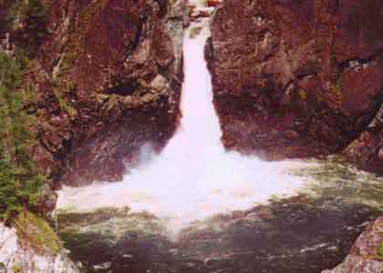 24 июля Дежурные Рома с Виталием. Всю ночь шел дождь, вода в реке прибыла на 30 см (а место не узкое). Цвет воды от зеленого перешел ближе к коричневому. Выходим часов около 11. Проходим оставшиеся пороги и шиверы до 19 порога. Перед ним встречаем группу из Кирова. Их стоянка расположена по левому берегу. Постепенно начинаем подходить к 19 порогу, перед ним чалимся, разведаем. Первую половину порога (до осыпи слева) решаем пройти как обычно, только пассажиры идут по берегу. Четверка проходит по основной струе ближе к правому берегу, я на двойке с Верой идем между камней недалеко от правого берега. Не доходя до осыпи метров 50 - чалимся. Стас с Ромкой идут на разведку, и мы остаемся ждать. Время близиться к обеду. Они проходили два часа, мы уже совсем собрались обедать. Спускаем катамараны дальше, за осыпь, на чалках. Затем проходим на четверке сильным экипажем еще метров 300. Двойку спускаем на чалке. Вода несет уже совсем бешенная, ближе к водопаду уклон увеличивается. С этого места (метров за 300 -400) начинаем обнос. Сначала несем рюкзаки. Вдоль по склону идет тропа. Мы пристали немного ниже маленького ручейка. Первые метров 200 тропа идет одна. Затем она разветвляется на две. Нижняя, по которой мы обносились, - нормальная тропа. По ней можно нести даже неразобраный катамаран четверку (правда тяжело). В одном месте там нужно штурмовать крутой каменный подъем, а, несколько дальше, есть достаточно крутой спуск. Длина тропы до того места, откуда мы собирались выходить, около 3 -3.5 км. Идти с грузом около 40 минут. Пройдя метров 100 по тропе, видна последняя горка перед водопадом. Слив с огромной бочкой смещен несколько вправо от центра реки. По моему мнению, в нашу воду этот слив категории 5..6, в нем могло бы спокойно кильнуть нашу четверку. Тропа обноса идет по заболоченной местности, и пригодных для стоянки мест долгое время нет. Тропа идет высоко, но можно спокойно приблизиться к краю обрыва и рассмотреть пороги в ущелье. Первый порог - водопад,