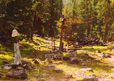 От этого дацана мы шли еще 1.5 часа по долине. Общее время хода - 10.5 часов. Стас в прошлый раз шел на Шумак 9 часов. Мы расположились лагерем на правом берегу Шумака на поляне вблизи моста через реку. Там были еще домики, в которых жили другие группы. В этом месте - слияние двух Шумаков. Основные источники расположены по левому берегу, радоновые - по правому. Перед слиянием - мост через реку. Вблизи нас были радоновые бани, радоновый глазной источник и другие. Место было нормальное, только мало дров в лесу.