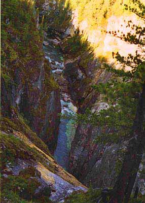 который еще иногда называют турбиной. Река шириной метров 40 сваливается в щель шириной 3 - 4 метра. Эта щель непрямая, а изогнутая наподобие лопасти винта. Вода падает с высоты метров 3 и на всем протяжении с силой бьет в скалу. Следующее препятствие - через метров 50 несколько разбросанных в русле обливных камней и затем струя бьет левобережную скалу, в которой промыт большой подводный карман. Эти оба препятствия - непроходимы. Далее в каньоне идет ряд порогов попроще. Один из следующих мы хорошо рассмотрели со скалы сверху. Называется он -- "Винт". Посередине каньона стоит огромный камень. Струя обходит его справа. Поток идет на спад по большой дуге, так, что вливается в дальнейший поток под углом 90 градусов с правой стороны. На слиянии струй - косая бочка. Порог, проходимый при нормальной страховке (в каньоне это несколько затруднено) и сильном экипаже.