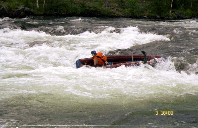 Итак, мимо Киры, который уже занял свое место в перевязанных упорах, и Димки Куликова, который начал перетаскивать "Матрас" к верхнему краю улова, проплывает девушка и просит помощи. Решение принимается совместно и незамедлительно. Под вопль Киры: "Садись быстро!" Димка прыгает в лодку, и они бешено начинают выгребать на струю. Теперь уже Димка не успевает встать в упоры, а место старта, выбранное впопыхах, не позволяет им поставить судно вдоль струи, и в Б1 третьей ступени их кладет. Внимание многочисленных зрителей теперь обращено уже на два терпящих бедствие судна. Между тем девушка вместе с каяком входит в котел Б2 и повторяет печальный опыт Димки образца 1995 г. - в весьма жесткой Б2 судно и экипаж почти неизбежно теряют друг друга. Теперь даже с берега видно, что положение девушки более чем критическое - она потеряла предпоследнюю опору (весло все еще при ней) и с трудом удерживает голову над водой. Спасает то, что она уже вышла в шиверную четвертую ступень.